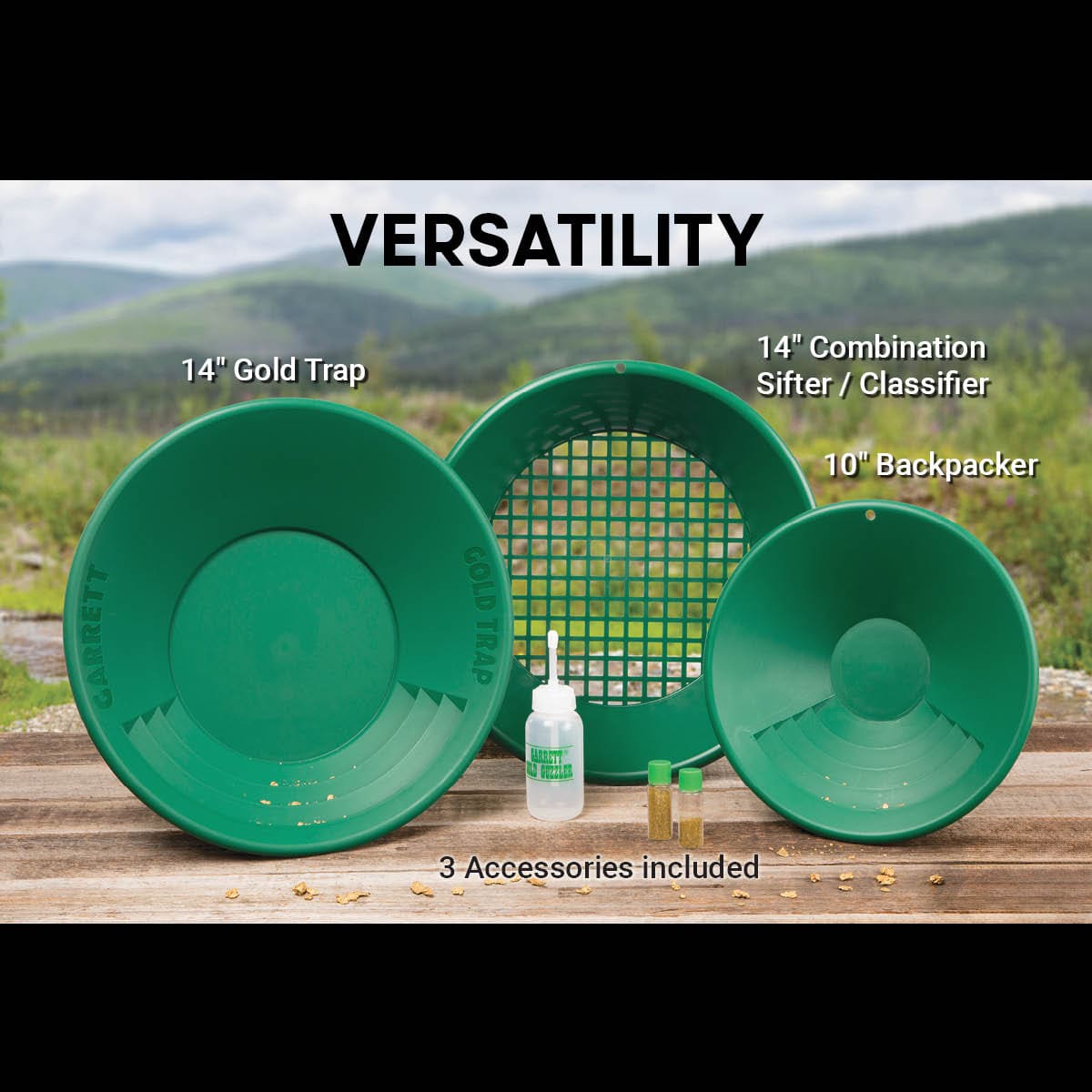 Garrett's exclusive 90 degree riffled design prevents gold from sloshing out of the pan.