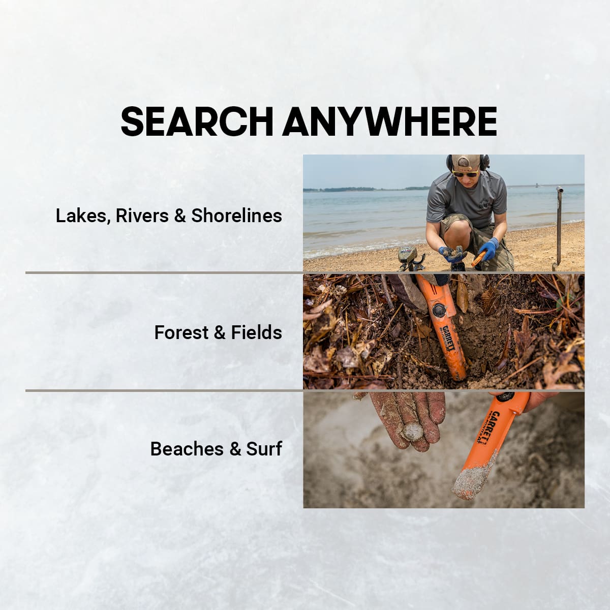 - Tune out mineralized ground, wet beach sand, etc.